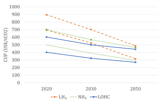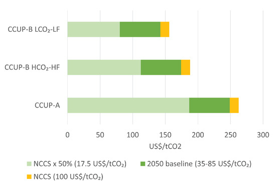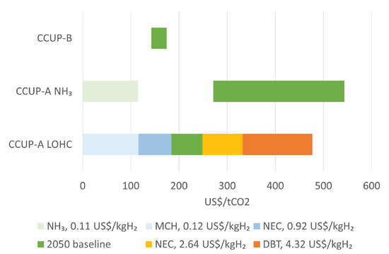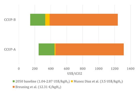 CCUP for both production scenarios under varying hydrogen production costs [49,50].