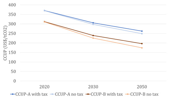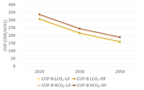 Intuitively, we see that the CCUP is smaller than the CUP. Furthermore, the CCUP is a more accurate computation of the utilization cost of captured for synfuel production as it also takes into consideration the emissions avoided from fossil-based fuel production under a business-as-usual setting.