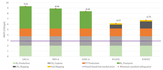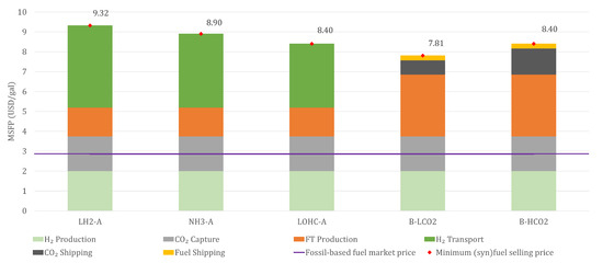 For this paper, we focus on green hydrogen-based synfuels produced through the Fisher–Tropsch process due to their compatibility with current petroleum products and minimal need for infrastructure configuration [23] (see Nguyen and Blum [28] or Ram and Salkuti [22] for an overview of synfuels). Several papers on synfuel production have considered centralized systems, integrating several major processes to maximize the potential benefits of system integration. These include the integration of renewable energy sources [6], the hydrogen feedstock production process [8], and the capture process [7]. However, given our previously defined scenarios, we need to decouple these processes from the synfuel production itself. Specifically, we need to consider the use of external feedstock sources such as imported hydrogen or capture exports. We refer to the work of Zang et al. [9], who develop an Aspen Plus model that simulates the production of synfuels via the Fisher–Tropsch (FT) process with exogenous hydrogen and feedstock inputs. They conduct a techno-economic analysis using the simulated production system and find that the hydrogen price has the largest impact on the synfuel production cost. Their study also includes a sensitivity analysis of the other model parameters such as the price. Our study builds on their initial assessment by incorporating the current costing literature on hydrogen production, carbon capture and utilization, and fossil-based fuel production to arrive at costing estimates for the aforementioned production scenarios, which include previously unconsidered factors such as the hydrogen transport pathway or shipping overseas. This allows us to provide better context for the estimated values and arrive at a more grounded assessment for the potential of synfuel as a utilization method.