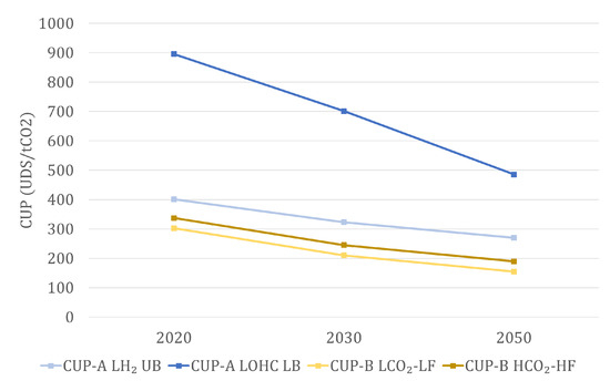 Note that the projections for hydrogen production costs are already quite low. However, several studies have more conservative forecasts for the hydrogen production cost, with Munoz Diaz et al. [49] giving an estimate of USD 3.5/kg and Breuning et al. [50] giving an estimate of approximately EUR 12.31/kg. Figure 7 illustrates the change in CCUP under these scenarios. Clearly, the viability of synfuel production as a utilization method is dependent on the hydrogen production cost being low. Other than technological improvements, government subsidies can be a possible mediating factor to lower the hydrogen production cost. For instance, the Inflation Reduction Act in the United States projects to give subsidies of up to USD 3/kg, which can significantly lower production costs [51].
