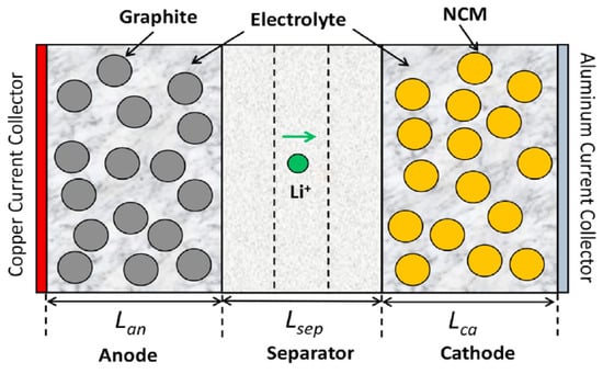 An electrochemical–thermal model was established for a 5 Ah NCM811-21700 cylindrical battery cell using the commercial CFD software ANSYS FLUENT 2022R1 [26]. The electrochemical model was based on the physical-based Newman P2D model, which evaluated the ion concentration and potential distribution of the battery cell [5]. The heat generation, heat dissipation, and temperature distribution of the battery cell were calculated by coupling P2D and thermal models. The cell structure consisted of several layers, including current collectors, porous electrodes, and a separator along the cell thickness, which was used for the thermally coupled Newman P2D electrochemical model, and is shown in Figure 1.