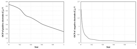 An expression for the OCP curve was required in the simulation and was fitted as a function of stoichiometry for both the positive and negative electrodes from the experimental dataset [30]. In this study, the correlations in the literature are represented as polynomials in the stoichiometry by Equations (25) and (26) and are shown in Figure 2.