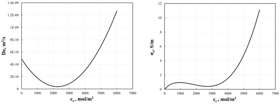 The electrolyte diffusivity for the electrode and conductivity of the electrolyte are concentration-dependent and are expressed by Equations (27) and (28) [30], as shown in Figure 3.