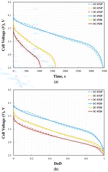 The developed thermally coupled electrochemical P2D model was validated using data obtained from an experimental study by Catenaro et al. [33]. Initially, the model was validated using experimental data of battery voltage versus time and DoD during the discharge process with the different discharge rates of 1C, 2C, and 3C at a steady ambient temperature of 25 °C. As shown in Figure 6, the simulation results of the cell voltage are consistent with the experimental data for every discharge rate. An error analysis was also performed. Given the discrepancy in the number of simulation results and experimental data, the error analysis was conducted according to the following steps: First, the simulation results were fitted into a polynomial about the DoD. The DoD values from the experimental data were substituted into this polynomial to obtain the corresponding fitted values. Finally, the fitted values were used for error calculations against the experimental data. Therefore, the error between simulation result and experimental can be defined as: