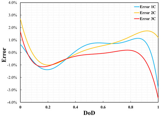 where θfitted and θexp indicate the fitted data from the simulation result and the experiment data, respectively. The error in the cell voltage is shown in Figure 7. The maximum errors for 1C, 2C, and 3C were 2.8%, 2.7%, and 3.6%, respectively. Larger errors usually appear at the beginning or end of battery discharge. This may be due to unstable measurements of the battery at the beginning or end of discharge. The P2D model accurately reflected the voltage change during the battery discharge process.