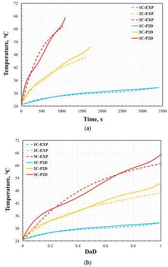 The thermal performance is also validated by the comparison of the cell surface temperature profile between simulation results and experimental data versus time and DoD during the discharge process with the different discharge rates of 1C, 2C, and 3C at a steady ambient temperature of 25 °C. As shown in Figure 8 and Figure 9, the error in the temperature profile was relatively large, especially under the conditions of 2C and 3C. The same method was used to analyze the error in the temperature profile. The maximum errors at 1C, 2C, and 3C were 2.4%, 9.7%, and 9.8%, respectively. The temperature profile under the 1C discharge process was significantly smaller than those of 2C and 3C. This is because, in the P2D model, there are many parameters based on temperature variables, such as the specific heat of the battery and thermal conductivity. However, this study did not consider the effect of temperature on these parameters because of the lack of reference data. However, the measurement of battery temperature also has significant instability. This is affected by the measurement location, measurement accuracy, and external heat transfer conditions. Even in a constant temperature chamber, the heat transfer coefficient on the battery surface is uncertain. Therefore, when the battery was discharged at 2C and 3C, the temperature was much higher than the reference temperature, which led to large errors in the simulation results. In addition, the temperature error curve was not as smooth as the voltage error curve. This was likely because the temperature measurements were less stable than the voltage measurements during the experimental process. However, compared with other numerical analysis studies [8,13,14] on batteries of the same type, this error was not significant. Therefore, it can be said that the model’s reliability has been verified under the ambient temperature of 25 °C.