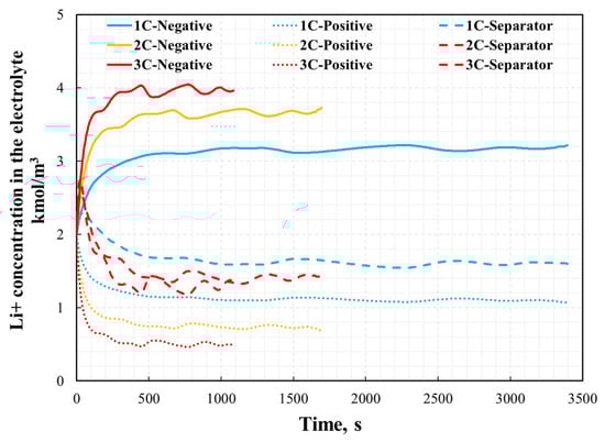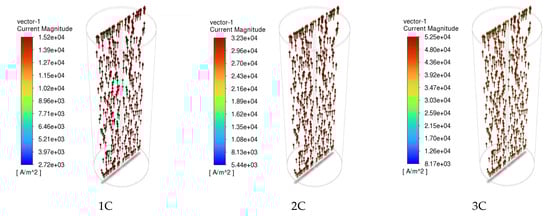 The distribution of the current density inside the NCM811-21700 battery under the 1C, 2C, and 3C discharge processes is presented in Figure 10. The arrows are colored according to the magnitude of the current density. As shown in Figure 10, the direction of the arrows indicates that the electrical current is input via the negative current collector tab (bottom) and then output through the positive current collector tab (top). The magnitude of the current density correlates well with the discharge rate. In lithium-ion batteries, electrolyte solutions play the role of ionic conductors and unavoidably create concentration gradients during the operation of the battery. Recent studies [34] reveal that beyond these gradients, unique lithium-ion (Li+) concentration waves are generated in the electrolyte of graphite-based porous electrode/lithium cells. This particular phenomenon was also scrutinized in this simulation’s approaches and is presented in Figure 11. The formation of these waves stems from the irregularities in the reaction distribution within the porous electrode, and they are influenced by both thermodynamic factors, such as open-circuit voltage (OCV), and kinetic factors, such as the unevenness of the charge transfer reaction.