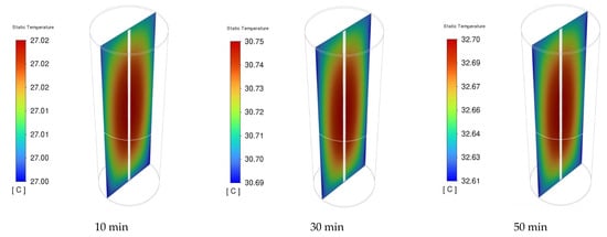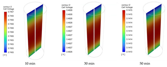 Figure 12 presents the distribution of the NCM811 21700 battery cell voltage of the 1C discharge rate at time intervals of 10, 30, and 50 min. During the discharging process, the cell voltage was not uniform across the entire cell. However, there was a slight drop in the overall battery working voltage from 2 to 50 min of discharge time, indicating a stable discharge voltage of the NCM811 battery. A significant potential gradient is observed near the positive end (top) of the cell. This can be attributed to the composition of the positive current collector and tab made of Al foil, in contrast to the negative current collector and tab (bottom tab) made of Cu foil, which has a higher electrical conductivity than Al foil. Moreover, the unevenness of the local cell voltage can be attributed to the heterogeneous electrochemical reaction rate in the battery. The local cell voltage was determined from the difference in potential between the positive and negative current collectors. The temperature distributions inside the battery cell under a 1C discharge rate at 10, 30, and 50 min are presented in Figure 13. The temperature gradient in the battery from the center to the outside surface is presented because of heat loss to the constant-temperature boundary condition. Although the temperature difference between the battery surface and the center is small, it can still be observed that this temperature difference increases with increasing discharge time.