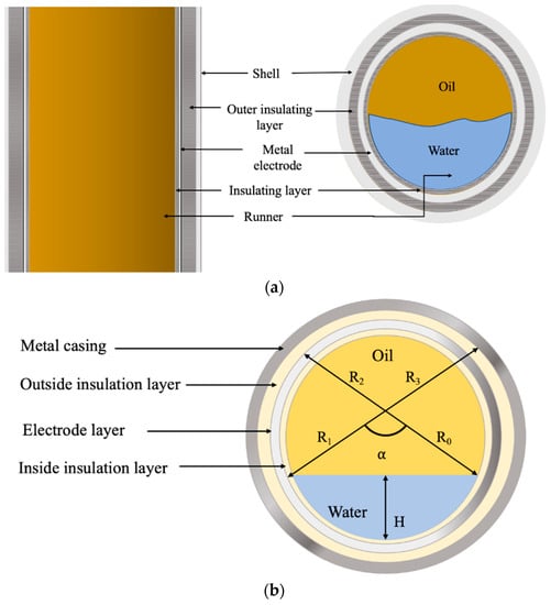 - Liu, X.; Hu, J.; Xu, W.; Xu, L.; Xie, Z.; Li, Y. A new cylindrical capacitance sensor for measurement of water cut in a low-production horizontal well. J. Phys. Conf. Ser. 2009, 147, 012002. [Google Scholar] [CrossRef]