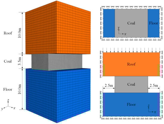 Using the FLAC3D three-dimensional simulation platform, we set out to assess the bearing capacity of coal yield pillars when subjected to cable reinforcement. The stability of these coal pillars, which play a pivotal role in the redistribution of abutment load, hinges on the mechanical attributes of the encompassing rock and the geometry of the roof-coal-floor assembly. As such, we constructed a numerical representation encapsulating the roof, the coal pillar, and the floor to delve into the deterioration processes affecting coal pillars. Refer to Figure 2 for a detailed view of the pillar model’s grid structure and the designated boundary conditions. We varied the pillar’s width to represent pillars with w/h ratios ranging between 1.5 and 2.5.