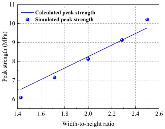 The modelling results show peak strength rose as cable support strength increased. This phenomenon can be explained by the pillar’s yield mechanism. The pillar was constrained by the cable to expand to free space, and the pillar’s bearing capacity was ameliorated. Meanwhile, the percentage increase in peak strength for wider pillars exceeded that for narrow pillars. For instance, the modelling predicted that the peak strength of a 9.0 m wide pillar would increase by 4.37% with a cable support strength of 0.60 MPa, while the peak strength of a 5.0 m wide pillar would increase by 2.91% under the same cable support strength. As shown in Figure 4b, when the support strength was below 0.30 MPa, the predicted rising in pillar strength was less sensitive to the w/h ratio or pillar width. When support strengths were over 0.30 MPa, the strengthening effect of cables on peak strength increased rapidly with pillar width. The modelling results suggest that the cable more so affected the wider coal pillar’s peak strength.