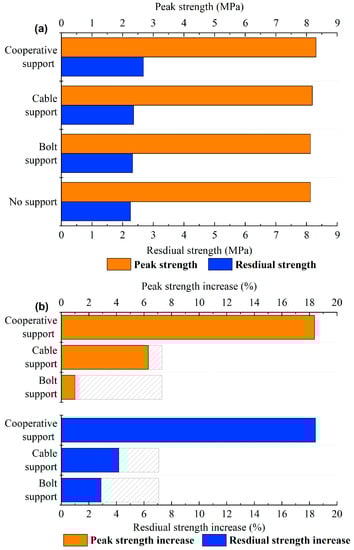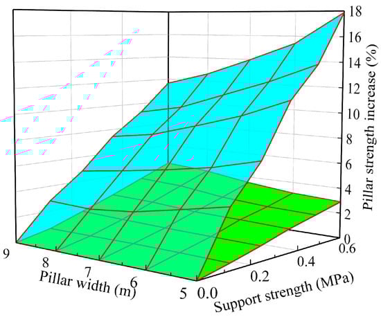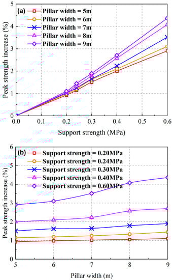 Figure 6 shows that as the pillar width was maintained, the increase in peak strength and residual strength increased gradually with support strength. Meanwhile, when the support design was maintained, the increase in peak strength increased with pillar width; however, the increase in residual strength showed the opposite law. As the support strength turned to 0.60 MPa, the pillar width increased, ranging from 5.0 to 9.0 m; the peak strength increased from 2.91% to 4.37%; and the increase in residual strength decreased from 17.88% to 11.63%.