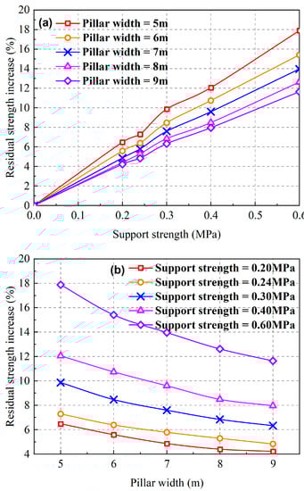 Residual strength increase versus support strength of two-ended cables: (a) residual strength increase versus support strength of two-ended cables; (b) residual strength increase versus pillar width.