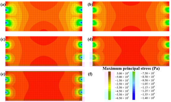 Distributions of support stress for various support designs: (a) support design with 500 mm row spacing; (b) support design with 750 mm row spacing; (c) support design with 1000 mm row spacing; (d) support design with 1250 mm row spacing; (e) support design with 1500 mm row spacing; (f) legend.