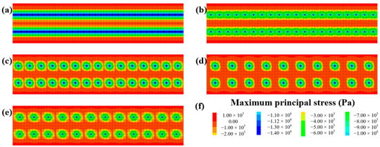 Support stress distributions for various support designs: (a) support design with 500 mm row spacing; (b) support design with 750 mm row spacing; (c) support design with 1000 mm row spacing; (d) support design with 1250 mm row spacing; (e) support design with 1500 mm row spacing; (f) color scale.