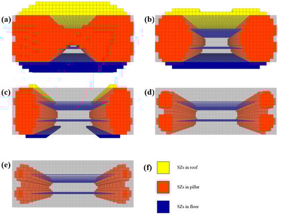 Furthermore, to explore the distribution of stress owing to different cable support designs, zones with principal stress above 10 kPa were confirmed and marked as SZs with the FISH code according to Figure 7 and Figure 8. Table 4 and Figure 9 show the results. It is clear that the SZ distribution varied obviously with different cable row spaces. As the row spacing decreased, the SZs extended to a longer distance on both sides of the pillars. Figure 9e presents that with a 1.50 m row spacing, the SZs were relatively in isolation and the support stress stretched 1.25 m to the pillar on both sides. The SZs only occupied 11.56% of the entire pillar zones. As soon as the row spacing decreased to 1.25 m and 1.00 m, the support stress owing to adjacent cables was superimposed, and the support stress extended 1.5 m and 2.25 m to the pillar. The SZs rose to 24.90% and 44.39%, respectively. As the row spacing decreased to some extent, such as 0.75 m and 0.50 m, the SZs on the both sides of the pillar were linked together, and the entire coal body on the pillar’s surface was in the support stress zone. The support stress rises the radial stresses effectively and ameliorates the stress state in the pillar.