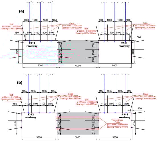 The support scheme before optimization is illustrated in Figure 11a. High-strength anchor rods with diameters of 22 mm and lengths of 2500 mm were employed for the roadway roof and rib support, respectively. Additionally, a 1 × 7 type cable with a diameter of 17.6 mm and a length of 6300 mm was used to support the roof, with spacing intervals of 1600 × 3000 mm. The pre-tension forces for the anchor rods and cables were 80 kN and 250 kN, respectively.