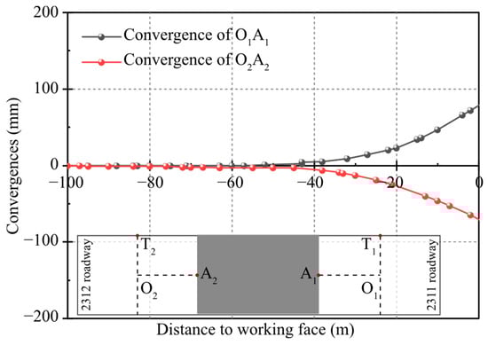 To ascertain the viability of the newly proposed coal pillar stability control methodology, we adopted a cross-measurement technique, visualized in Figure 12. This technique aimed to meticulously record the deformation patterns of the surrounding rock in relation to the coal pillars located within the 2311 and 2312 roadways during the extraction processes at the 8311 working face. At the central zones of the roofs in both 2311 and 2312 roadways, specific pins were anchored onto the ribs of the yielding coal pillars. Within this context, the terms “A1O” and “A2O” specifically denote the convergence metrics of the ribs in the 2311 and 2312 roadways, respectively. A comprehensive representation of these measurements is provided in Figure 12.