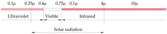The radiations that reach the Earth are the following: ultraviolet radiation (3%), visible radiation (42%) and infrared radiation (55%). They have different wavelengths [] (p. 11), as shown in Figure 1: