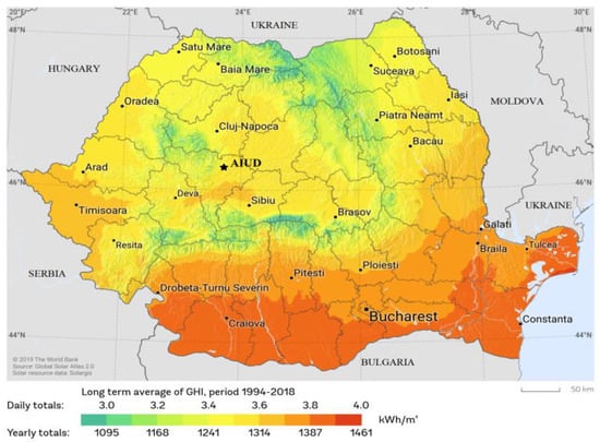 In Romania, five different geographical areas were identified according to the level of recorded energy flow, as it is shown in Figure 3 []. The geographical distribution regime of the solar energy potential shows that more than half of the country’s surface benefits from an average annual solar irradiation of 1200 kWh/m2.