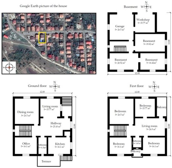 The house for which the study was conducted, in order to improve its energy performance, is situated in Aiud-Alba County and was built in 1998. It has a building footprint of 144 m2 with a basement and 2 stories (Figure 4). The height of the stories is 2.50 m. The roof of the house has two sides with an E–W orientation, having an 35° inclination. At that time, at least in our country, there was no special emphasis on the energy performance of buildings both due to the lack of appropriate materials and technologies as well as the mentality of the people, who did not realize the need for a special respect for energy consumption and the environment.