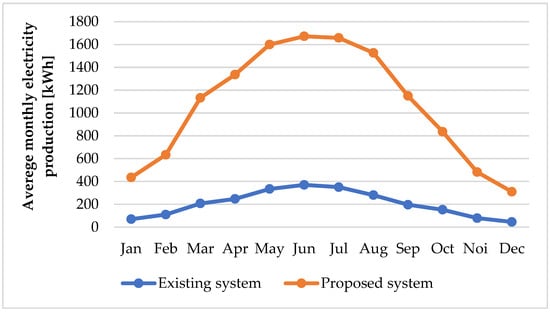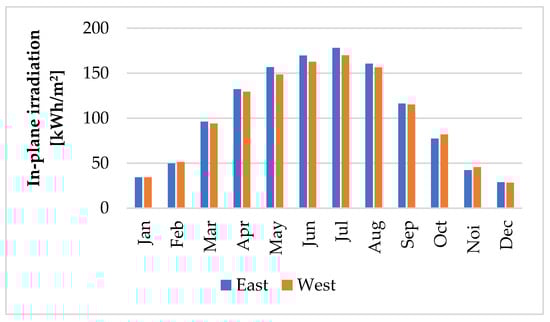 The level of solar radiation is one of the essential factors that influence the performance of the photovoltaic system. The PVGIS program allows access to information about hourly, daily or monthly values of solar radiation. Thus, Figure 5 shows the monthly values of solar radiation for the location of the studied house. The panels respect the slope of the roof, respectively 35°.