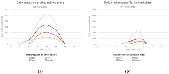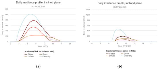 Daily average irradiance on a fixed plane with a slope of 35° and azimuth of −90° (East). (a) July. (b) December.