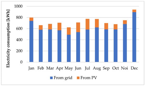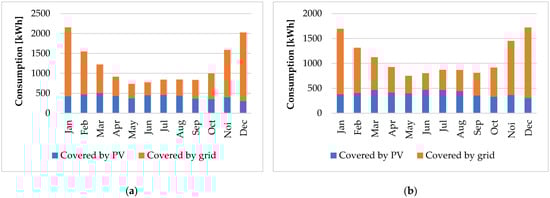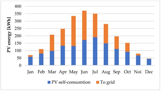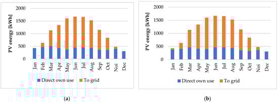 Although the total annual electricity produced by the PV system represents 88% of the annual consumption in case 1 and 96% of the annual consumption in case 2, in fact, only 39% of the energy produced by the PV system is used for own consumption in case 1 and 37.7% in case 2, as shown in Figure 21.