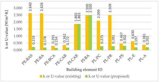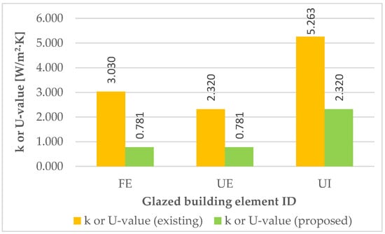 Analyzing Figure 12, one immediately notices the positive effect of the proposed changes for the structures of the building elements, by using efficient thermal insulation materials that are friendly to the environment and the use of modern glazed building elements with a high thermal resistance or an equivalent low OHTC.