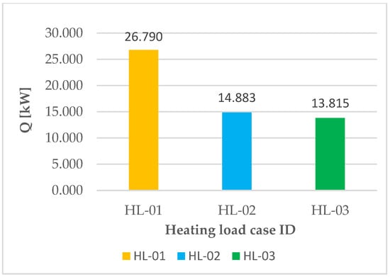 The heating load for case HL-02 represents only about 55.55% of the heat requirement for the HL-01 case and, moreover, reducing the indoor temperatures to the conventional values according to [] for HL-03 case leads to an even lower value of the heating load QHL-03, representing only about 51.56% of that corresponding to the HL-01 case. The annual heating load expressed in kWh/m3·year or the equivalent for typical comparations in kWh/m2·year represents only about 53.88% of the annual standard heating load normed by [].