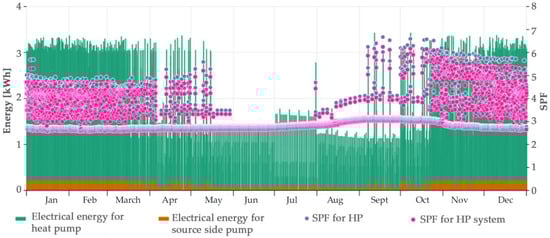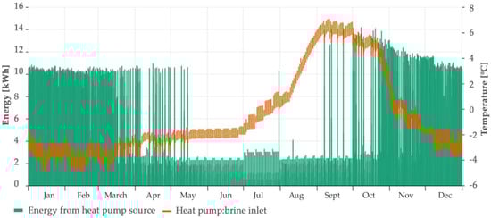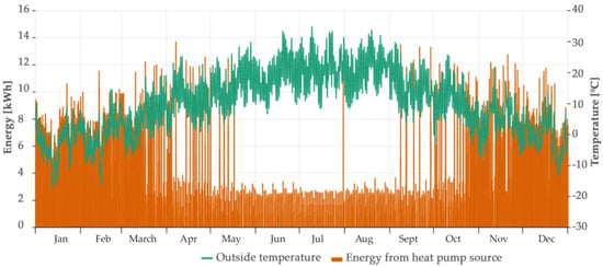 The simulations for the heat pump systems were made using GeoT*SOL software, a professional tool for the design and calculation of heat pump systems []. Considering climate data for different locations, databases for different types of systems and components, various heat sources and modes of operation, the heat pump systems can be simulated, determining the energy generated, electricity consumption (from yearly to hourly scale) and seasonal performance factor (SPF) [,].