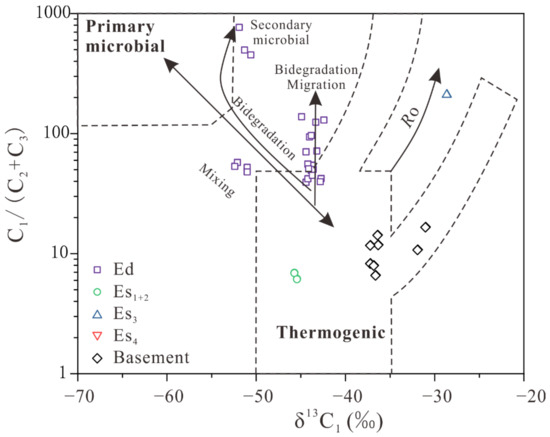 We analyzed natural gas samples from the study area using the C1/(C2 + C3) − δ13C1 correlation diagram developed from [34,35] (Figure 5). Analysis showed that samples from the Shahejie Fm and the basement display a consistently low C1/(C2 + C3) ratio and heavy δ13C1, indicating a thermogenic origin. Upon further classification, three types emerge: gas samples from Es1+2 demonstrate a low C1/(C2 + C3) ratio (<5) and light δ13C1 (<−39‰), suggesting a sapropelic type; gas samples from the basement present a higher C1/(C2 + C3) ratio (>10) and heavy δ13C1 (>−34‰), implying a humic type; and gas samples from Es3 show a high C1/(C2 + C3) ratio (>100) and heavy δ13C1 (−30‰), suggesting a highly mature humic type. As for gas samples from the Ed, they can be further subdivided based on δ13C1 values: samples with δ13C1 > 45‰ display a higher C1/(C2 + C3) ratio (>40), indicating significant biodegradation influence; and samples with δ13C1 < −45‰ show a higher C1/(C2 + C3) ratio and reside in a transitional zone, suggesting a potential thermogenic and biodegraded gas mixture (Figure 5).