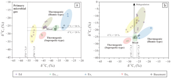 The natural gas samples of Ed exhibit a heavier δ13C3, indicating biodegradation. Some of these gas samples also show a lighter characteristic by δ13C1 < −50‰, possibly due to mixing with biodegraded thermogenic gases, while others are likely secondary microbial gases. The natural gas samples from Es1+2 are characterized by δ13C2 > −28‰, indicating sapropelic-type gases. On the contrary, the natural gas samples from Es3 are characterized by δ13C2 < −28‰, indicating humic-type gases. Samples from the basement are predominantly mixed gases (mixed humic and sapropelic gas), with a minor proportion of humic-type gases (Figure 6).