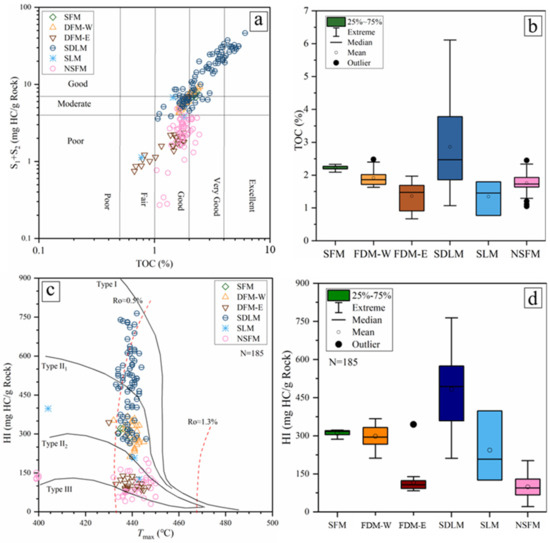 (a) Cross-plot of TOC versus (S1 + S2) [47]. (b) Box plot of mudstone types and TOC contents. (c) Cross-plot of HI versus Tmax of mudstones. (d) Box plot of mudstone types and HI contents.