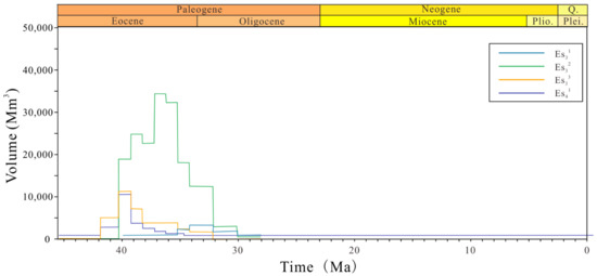 By assessing the volume changes in natural gas generated by source rocks from each unit along the AA’ cross-section over geological time, we can divide the entire process into a single hydrocarbon generation phase from 40 Ma to 34 Ma. Both Es41 and Es33 commenced gas generation concurrently. Es32 had the longest gas generation period, attributable to its maximum shale thickness, whereas Es33 had the latest onset of gas generation (Figure 9).