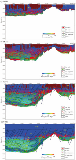 Simulation results of hydrocarbon migration and accumulation in Profile CC’ at 40 Ma (a), 38 Ma (b), 30 Ma (c), and 0 Ma (d). Under the background of overpressure.