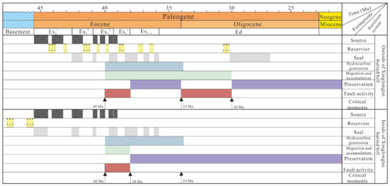 We have delineated the important elements of the petroleum systems both inside and outside the Xinglongtai structural belt (Figure 12). The main source rocks external to Xinglongtai are the Es4 and Es3 shales, with the reservoir rocks being the Es3, Es1+2, and Ed sandstones and the cap rock being the Ed shale. The generation of natural gas spanned from the middle Eocene to the early Oligocene period. The migration of natural gas is jointly dictated by hydrocarbon generation and the associated fracture systems. Importantly, faults activated during the Oligocene period restructured the deep natural gas reservoirs that were formed earlier, leading to secondary migration and accumulation of natural gas. As such, the crucial period for the system outside Xinglongtai transpired during the Oligocene period. Within the confines of Xinglongtai, the principal source rocks are also the Es4 and Es3 shales, with the natural gas stored in the basal fractures and the cap rock being the Es shale. The generation of natural gas likewise occurred from the middle Eocene to the early Oligocene period. The migration of natural gas is co-governed by hydrocarbon generation and fractures in rocks below the unconformity. Consequently, the critical moment for the system within Xinglongtai occurred in the mid-Eocene period.