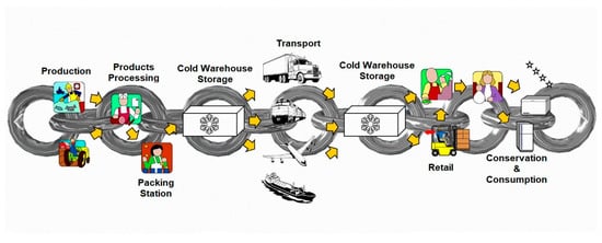 The cold chain begins with production; it continues through the storage phase in refrigerated platforms, followed by the transport phase up to the sales warehouses and refrigerated counters of the points of sale, and ends with the final consumers’ coolers. Every step is essential for the success of the cold chain process. More details are provided in Figure 1, which illustrates the phases of the food cold supply chain.