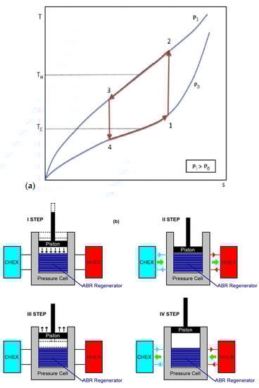 Lastly, as seen in Step IV (Figure 2b), the HTF flowing in the ABR results in heat being subtracted from the cold heat exchanger, thus achieving the desired cooling effect. Consequently, the regenerator undergoes an increase in temperature (transformation 4-1 of Figure 2a).
