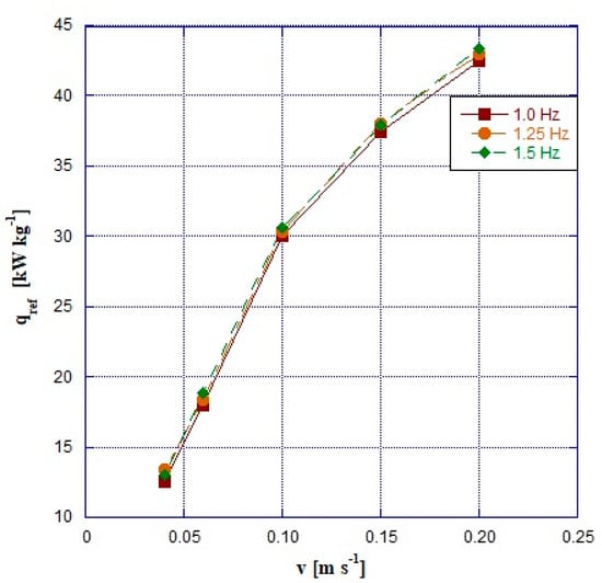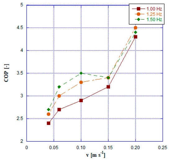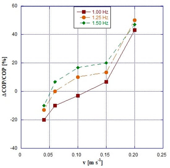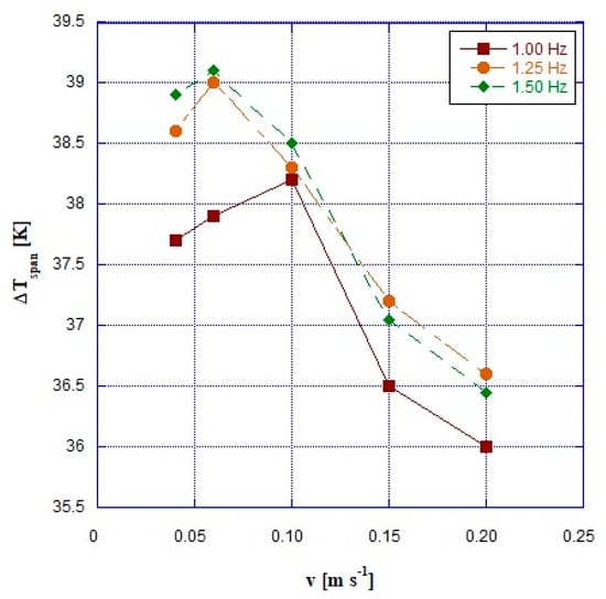 In this section, the energy performance of the elastocaloric device is evaluated when functioning in the cooling mode. The graph in Figure 4 illustrates that the variation in the temperature span, represented as ∆Tspan, consistently exceeds 35 K. This is an essential parameter for evaluating the performance of a thermal device, such as the elastocaloric device introduced in the previous section. A wide temperature span indicates a higher capacity to transfer heat and provide cooling or heating effects. At a speed of 0.10 m s−1 and a frequency of 1.5 Hz, the maximum ∆Tspan value reaches 39.2 K. It is interesting to note that there are two distinct regions in the graph. In the low-speed zone, the temperature increases, while in the high-speed zone, the temperature decreases. This effect is mainly due to the exchange time between fluid and barocaloric material; as the speed increases, the exchange time between fluid and material decreases, not allowing the thermal flow to fully undergo the exchange process. Therefore, there is an optimum air velocity for each frequency beyond which the temperature span values decrease.