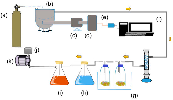 Schematic diagram of microwave pyrolysis system. (a) Nitrogen gas; (b) chamber; (c) auto tuner; (d) microwave generator; (e) data logger; (f) computer system; (g) two sets of condensers; (h) biogas collection; (i) bio-oil flask; (j) filter; and (k) vacuum pump.
