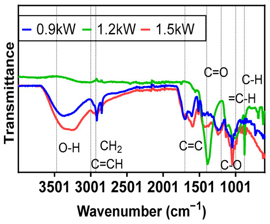 The FTIR spectrum of food waste bio-oil obtained at various power levels is presented in Figure 5. The analysis of the pumpkin peel bio-oil revealed a notable difference in the peak intensity of OH (phenols) and ketones. A lower microwave power (0.9 kW) resulted in bio-oil with higher concentrations of phenolic functional groups. Conversely, at 1.2 kW, bio-oil with a higher content of ketones and carboxylic acids and a lower concentration of OH groups was generated. Increased power levels contributed to higher heating rates, which enhanced the quality of the bio-oil by increasing the formation of aromatic functional groups and improving the heating value. However, excessive temperatures can have an adverse effect on bio-oil quality due to the high pyrolysis temperature, leading to the breakdown of aromatic compounds and their conversion into phenolic groups [11,26,32].
