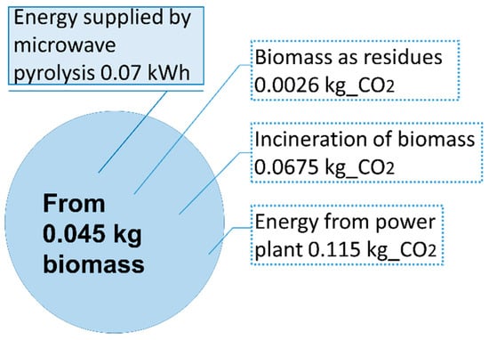 Bio-oil and biogas can be used for power generation, which is beneficial for reducing GHG emissions, e.g., by using biofuel and generators, respectively. However, biochar shows an extra value associated with carbon storage (carbon dioxide sequestration). Figure 6 illustrates the carbon dioxide (CO2) impact of various biomass management scenarios and energy generation methods. The microwave pyrolysis treatment of 45 g of food biomass produces 0.07 kWh of energy. In comparison, a power plant generates 0.115 kg of CO2 to produce the same amount of energy. This calculation takes into account the energy produced (0.07 kWh) and an impact factor of 1.57 kg CO2/kWh for traditional energy sources [11]. Alternatively, the incineration of the waste biomass can result in 0.0675 kg CO2 emissions. The disposal of waste leads to emissions of 57 kg CO2 per tonne [11], resulting in a total of 0.0026 kg CO2 emissions.