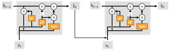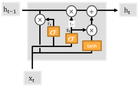 where , and W are not a value but a weight matrix. Equation (1) represents the state change in information through the update gate. Equation (4) is an expression for the update memory. The update gate is used to control the extent to which information from the previous state is brought into the current state. That is, the update gate helps the model to decide how much information from the past should be transferred to the future. Equation (2) represents the change in state of information through the reset gate, which determines how much past information needs to be forgotten.