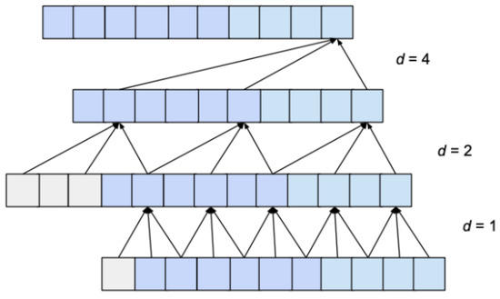 Traditional convolutional neural networks cannot capture long time dependencies well due to the limitation of their convolutional kernel size and are generally not suitable for modeling long time series, so in this paper, we use a temporal convolutional network to capture the temporal trend of each time node. The time series convolution network (TCN) proposed by Yu uses extended causal convolution to increase the receptive field of convolution [25]. Unlike the traditional convolution, the dilation type convolution allows the presence of interval sampling of the input during convolution. The temporal causal order is also maintained by padding the input with zeros, allowing the prediction of the current point in time to involve only previous historical information, as shown in Figure 4. The sampling rate is controlled by d in the figure. The bottom layer with means that every point is sampled for the input, and the middle layer with means that every 2 points are sampled for the input. Generally speaking, the higher the level, the greater the size of d used. Therefore, the dilated causal convolution makes the effective window size grow exponentially with the number of layers. This way, the convolutional network can obtain a large perceptual field with a relatively small number of layers [26].
