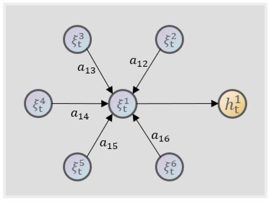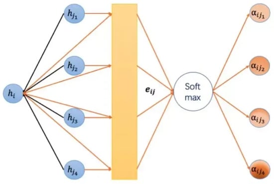 where is the set of nodes that are 1-distance neighbors to node i. We usually add an edge connecting node i to itself so that i itself is included in . is a normalization constant based on the graph structure. is an activation function. is the weight matrix of node feature transformations, shared by all nodes, where m denotes the dimensionality of the node feature vector. The graph attention model (GAT) replaces the fixed normalization operation in the graph convolution with an attention mechanism. Figure 5 and the following equation define how to update the lth layer node features to obtain the l + 1st layer node features.