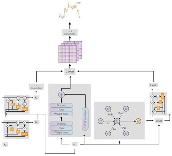 RNN is the most fundamental time-series prediction model, and the natural sequence modeling capability of RNN can handle time-series data well. On the basis of RNN, Li, Y et al. [18] proposed the DCRNN model, which enables RNN to input time series with multiple nodes in space at the same time by introducing the idea of a graph into the RNN. The DCRNN model is able to learn the spatial relationship of different nodes while learning the time dimension dependency. The other one is the model structure combining TCN and GCN [19]. TCN is a CNN model applied to time-series prediction, which increases the perceptual field area by null convolution and prevents data leakage by causal convolution. GCN [20,21] is a graph convolutional neural network, which is a convolutional neural network that can act directly on the graph and use its structural information. The first layer is fed with time-series data from all nodes in the graph, and an independent representation of each sequence is extracted by TCN [22]. After obtaining the representation of each sequence at each moment, the representations of all nodes within each moment are spatially fused using GCN. In addition to GCN, the Attention-based graph temporal prediction model GMAN [14] is also a mainstream approach. The modeling framework adopted by GMAN is different from both DCRNN and Graph WaveNet, and GMAN performs information extraction in both temporal and spatial dimensions in parallel at each layer, which are then fused by Gate. Since GCN is difficult to scale to large-scale networks and converges slowly in the training process, the proposed model in this paper adds the Attention mechanism to GCN by giving different attention weights to the edges between nodes in the graph and models the correlation between multidimensional feature variables by graph attention.