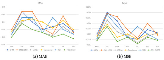 In the experiments of the UCI Electricity Load Chart public dataset, we compare TCN_DLGAT with several advanced methods, and the experimental results are shown in Table 2 and Figure 8. During the week, TCN_DLGAT performs much better than the recurrent neural network models, including LSTM and CNN_LSTM, and MAE, MSE and MAPE are lower than these models, as represented by Monday, where the MAE of LSTM and CNN_LSTM increased by 15% and 9% compared to TCN_DLGAT. Furthermore, the prediction error of TCN_DLGAT outperforms the models based on the attention mechanism (LSTNet and Transformer), whose MAE increases by 5% and 26% compared to both TCN_DLGAT. Compared with the temporal convolutional network (TCN), the MAE increases by 5% compared to TCN_DLGAT because the temporal convolutional network only increases the perceptual field and does not learn the dynamic change characteristics between the load data and the spatial correlation between other variables; therefore, it does not perform as well as TCN_DLGAT in terms of prediction results. This is also validating the importance of the dynamic information of the load data and the spatial correlation between the multiple variables that we proposed.