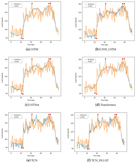 The comparison curves of the predicted and true values of the output of each of the six models on a particular day in the comparison experiment. The horizontal coordinates indicate the predicted time steps (96 time points in a day), and the vertical coordinates indicate the predicted load volumes. For several peaks of the load curve in a day (marked by red dots in the figure), only TCN and TCN_DLGAT predict such changes, and the MSE error of TCN_DLGAT is 10% less than that of TCN.