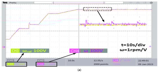 Figure 18a shows the experimental speed response characteristics, with the reference speed shown with channel 3 (green color) and the actual speed with channel 4 (purple color) of the oscilloscope. The speed obviously followed as expected, with only a few overshoots. When a sudden change in load torque occurred at a constant speed, it was seen that (zoomed view area in Figure 18a) there were little variations in speed, and this was because of the ability of the controller to support the desired speed. This claim is further verified by the speed following characteristic of the simulated system shown in Figure 18b, with identical settings to those of the system prototype.